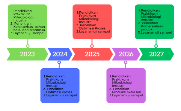 Laboratorium Bioproses merupakan fasilitas yang dibangun untuk mendukung pelaksanaan penelitian dan pembelajaran dalam bidang bioproses. Laboratorium ini dilengkapi dengan peralatan yang memungkinkan mahasiswa untuk melaksanakan penelitian maupun praktikum. Peralatan yang tersedia meliputi laminar air flow (LAF), autoclave, mikroskop, neraca analitik, rotary evaporator, hotplate stirrer, pH meter, oven, inkubator, heating mantle, alat analisis chemical oxygen demand (COD), waterbath, digital overhead stirrer, ultrasonic processor, dan timbangan duduk. Modul praktikum yang dilaksanakan di Laboratorium Bioproses mencakup pengenalan dan sterilisasi alat serta media pertumbuhan, pengamatan morfologi jamur dan yeast, perhitungan jumlah mikroba, pembuatan tempe dan tape, pembuatan bioetanol, dan pembuatan teh kombucha. Beberapa penelitian yang pernah dilakukan di fasilitas ini diantaranya meliputi tema tentang bioetanol, biobutanol, dan pengolahan limbah menggunakan alga. Roadmap Laboratorium Bioproses 2023-2027 dapat dilihat pada Gambar 1 sebagai berikut: